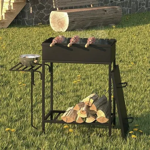 Коробка мангала по верхнему краю обварена металлическим прутком, предотвращающим деформацию стенок при нагреве. Вырезы для шампуров находятся с одной стороны коробки.