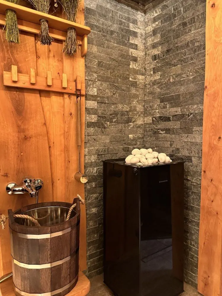 Тёмный стиль бани обеспечит полное погружение в таинство парения. Баня, наполненная паром, ароматами можжевельника, кавказских трав и фруктовых деревьев подарит незабываемые эмоции. Изюминкой данного проекта является потолок в виде солнца с лучами, визуально увеличивая пространство.