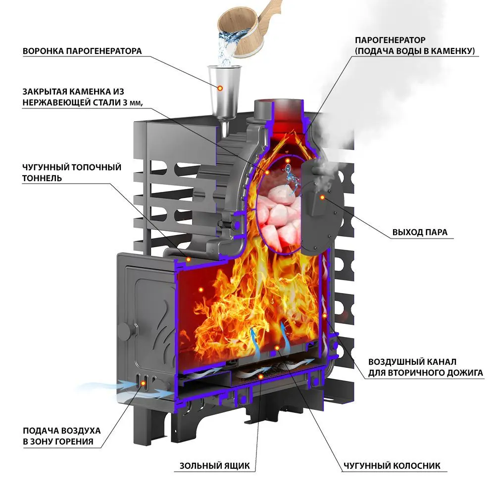 Закрытая каменка из нержавейки, размещённая в самом горячем месте печи.