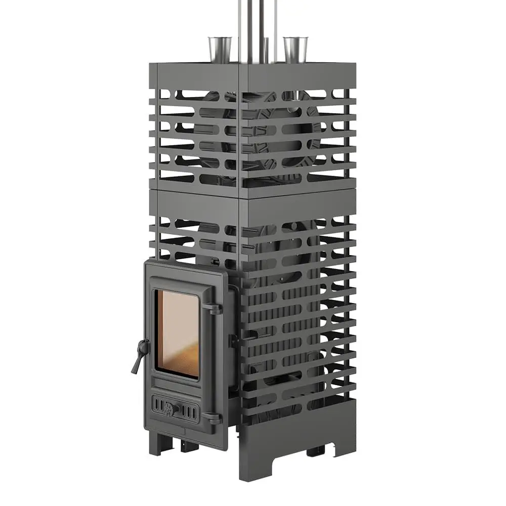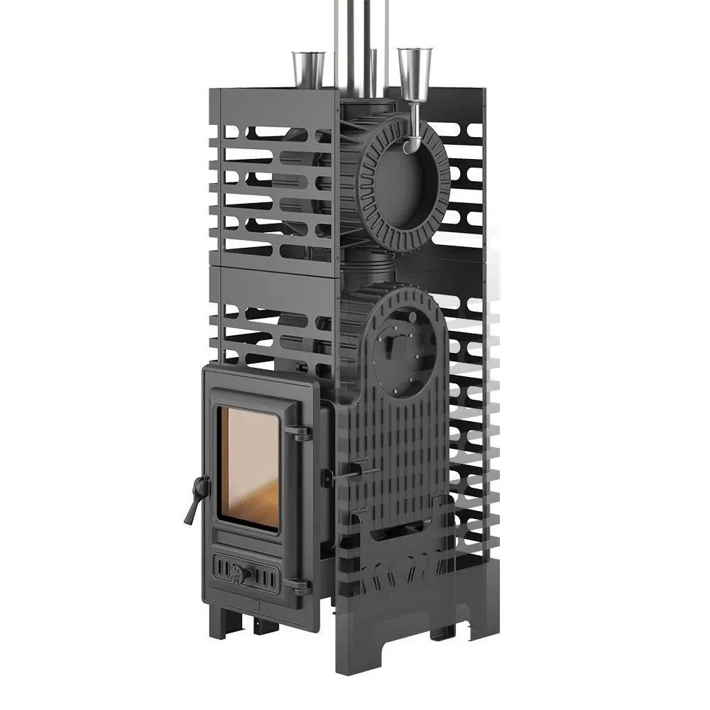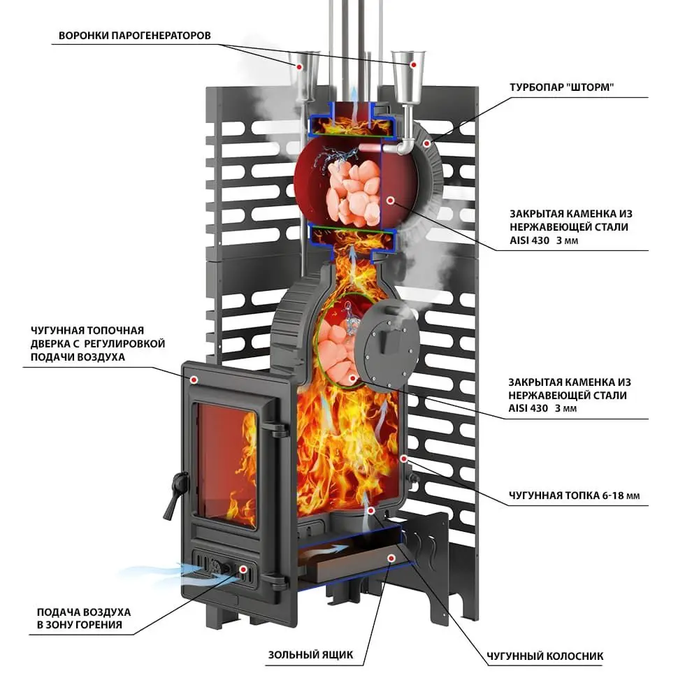 Комплект состоит из чугунной банной печи Астон Шторм 18 и чугунной натрубной каменки Турбопар. Объединение двух конструкций в единую систему заметно увеличивает тепловую отдачу термоагрегата, предотвращает перегрев дымохода, организует дополнительную каменку для получения качественного пара.