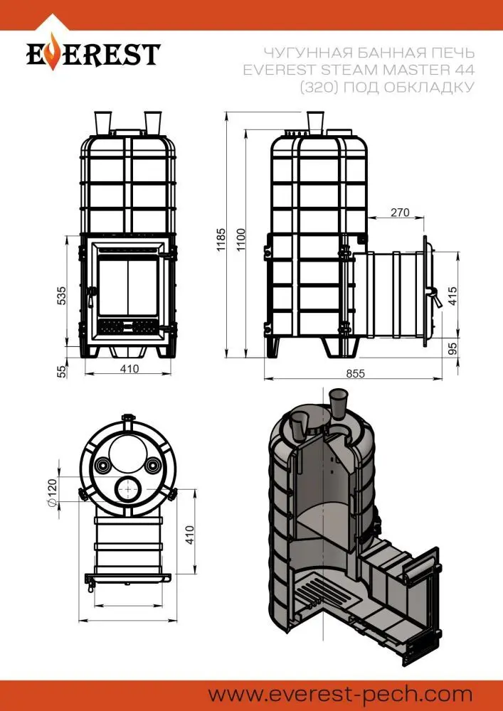 Банная печь Эверест «Steam Master» 44 (320) ЧУГУН (под обкладку) предназначена для нагрева помещений и получения пара в парных объёмом до 44 кубических метров.