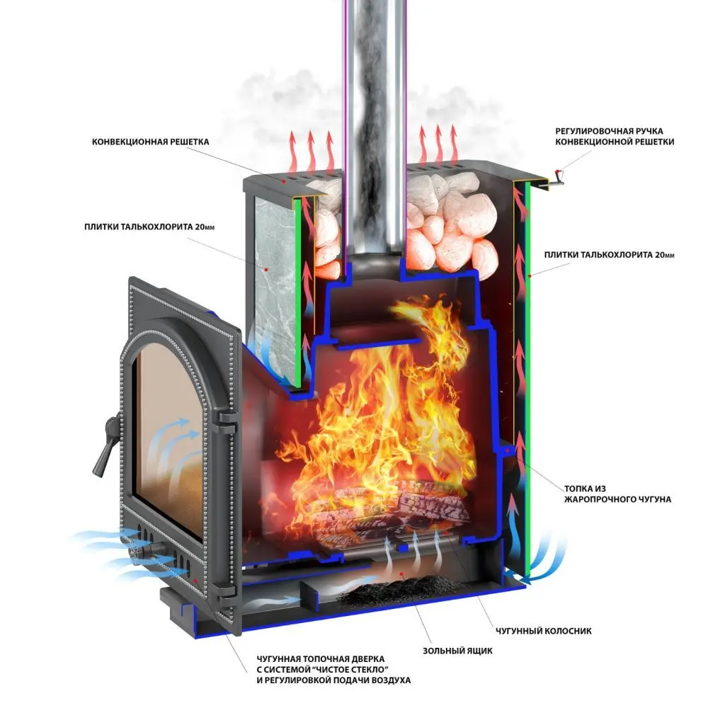 Преимущество печи в том, что топка печи состоит из 3-х ЧУГУННЫХ элементов. На стыке между ними используется керамический шнур с рабочей температурой 1200 градусов. То есть топка печи абсолютно герметична! Для фиксации деталей между собой применяется болтовое соединение, что даёт 100% гарантию безопасности при эксплуатации.