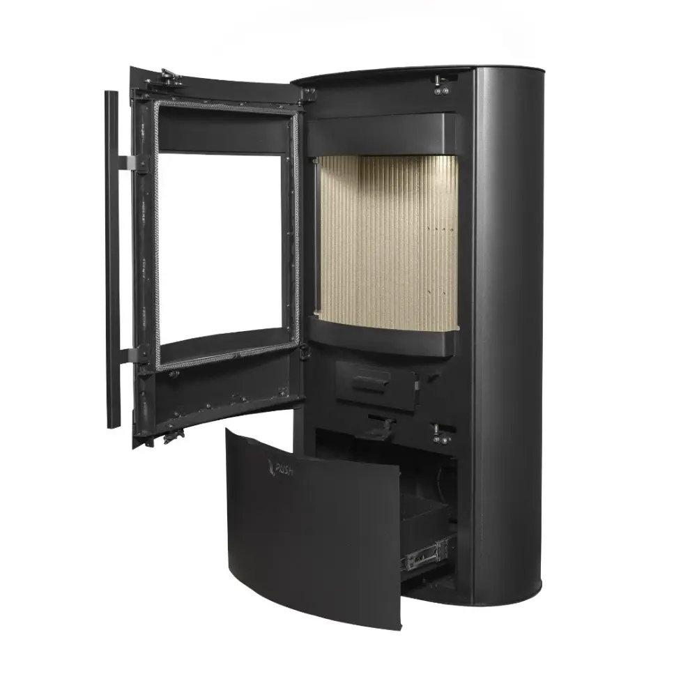 Стальная печь-камин “Свитязь NR” от бренда “Мета Бел” - это новейшая модификации полюбившейся многим модели “Свитязь”. В отличие от предшественницы, она не имеет поворотного механизма, вместо этого в нижней части корпуса расположилась объемная ниша с выдвижным ящиком, а общая высота печи увеличена - таким образом, новая модель получилась еще более изящной и компактной. Печь-камин рассчитана на установку в помещении объемом до 175 куб. метров, она быстро и равномерно прогревает воздух в помещении за счет конвекции