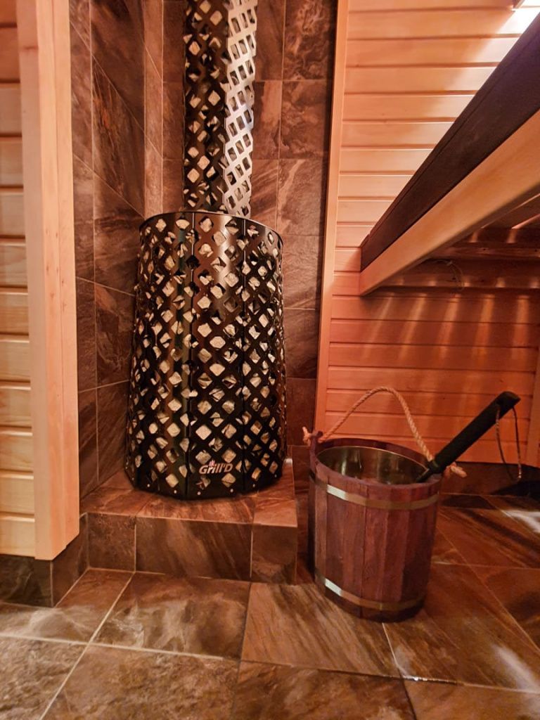 Парная выполнена в классическом стиле. Печь и сетка в едином стиле привносит изысканность и мелкодисперсный пар